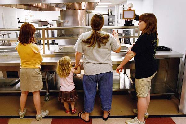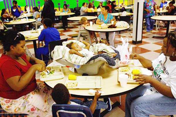 Hungry: Julie Morris stands with her three daughters while awaiting extras after the dining hall closed at the Family Gateway homeless shelter in Texas, where 337,000 children are homeless.
