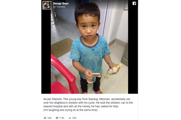 The post was shared with the caption, "As per Reports: This young boy from Sairang, Mizoram, accidentally ran over his neighbour's chicken with his cycle. He took the chicken, ran to the nearest hospital and with all the money he had, asked for help.