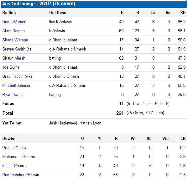 India started the batting with a overnight score of 462/8 and just added 3 runs to the earlier one as India lost remaining 2 wickets in the beginning only. Australia started its second innings aggressively, openers David Warner (40) and Chris Rogers (69) played to lead Australia towards winning. At a stage Australia were not comfort to score more because Indian bowlers tightened the game and none have scored more runs other than Shuan Marsh (62*), Ryan Harris is on crease at day ending with 8 runs.